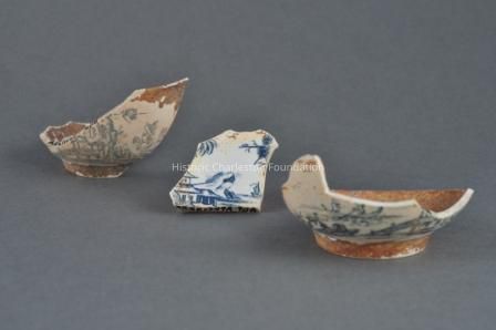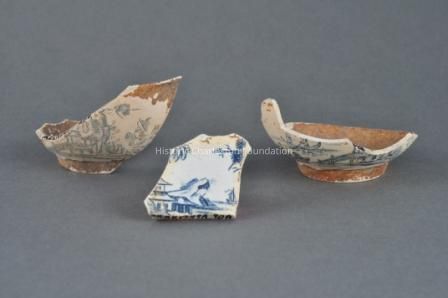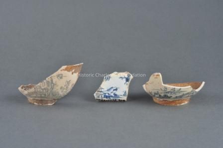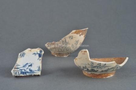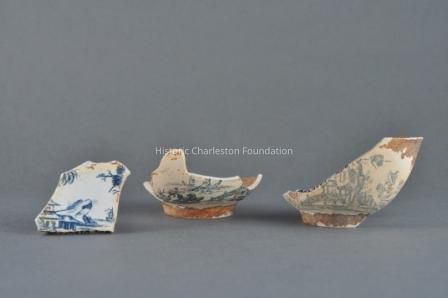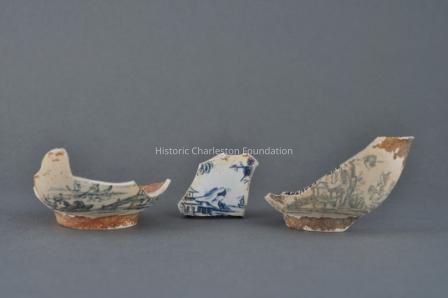 Unknown to ceramics historians until recently, John Barltam also made soft-paste porcelain. In the early 1990s, archaeologist Stanley South and historian Brad Rauschenberg uncovered fragments of blue decorated porcelain at Bartlam's Cain Hoy site, just north of Charleston, where he worked from 1765 to 1769. These fragments, three of which are seen here, indicated that Bartlam was successfully producing porcelain several years prior to the well-established manufactory of Gousse Bonnin (1741-ca. 1779) and George Robert Morris (1742/5-1773) in Philadelphia.
