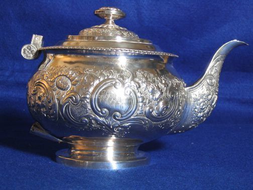 Teapot, silver, bulbous body on low circular base, having sunflower finial on attached cover over gadroon edge, floral repousse body, engraved with initial 'WHA' in script. Stamped with English hallmarks, makers mark C.P in rectangle (attributed to Charles Price, London) circal 1820-1821. Handle missing.Collection