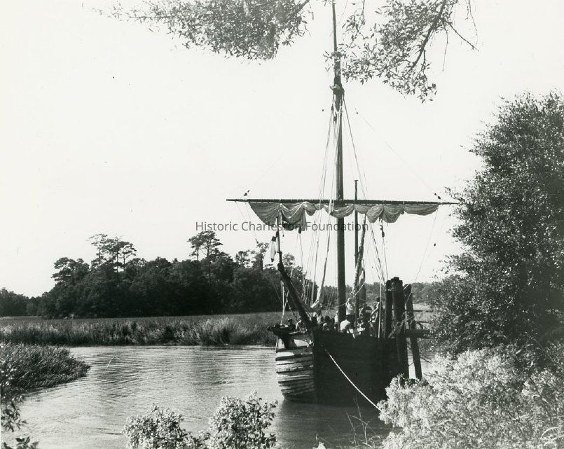 B&W photograph of the replica of the 17th century trading vessel "The Adventure" that is moored in Old Towne Creek at Charles Towne Landing. (Two copies of photo in sleeve.)Collection