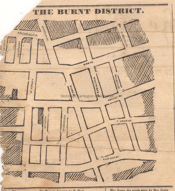 Charleston Courier article of 1838 showing map of "The Burnt District" (Ansonborough) and list of the homeowners. Large portion of the article; portion of left side missing (torn).Collection