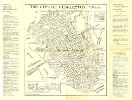 Map of the Charleston peninsula with historic points of interest identified and noted. Includes a welcome to visitors by Mayor Burnet R. Maybank and a map of "The Garden Club Walk" [a/k/a Gateway Walk].