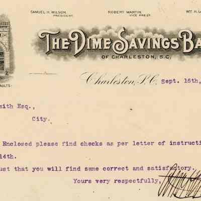 Letter from The Dime Savings Bank (signature illegible) to H.A.M. Smith enclosing checks. Dated September 16, 1903. Features an engraving of the building, which was significantly altered ca. 1954.