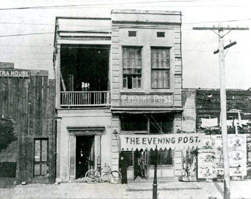 B&W photograph of first offices of The Evening Post (133 Meeting Street). Adjacent buildings also in view, including a portion of the opera house (left) and a building papered with advertisements for Arabian King Cigars (right). Gentlemen stand in the doorways and a bicycle is propped up against the wall of the building.Collection