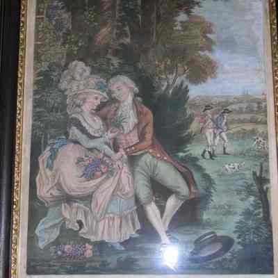 Medium: The watercolor had been damaged by exposure to light and possibly also be a previous restoration. The reds were orange, the greens were bluish, and all the other colors were thin. Some colors, like the dark blue of dresses, may have been recolored. The sky had been retouched in all the prints.