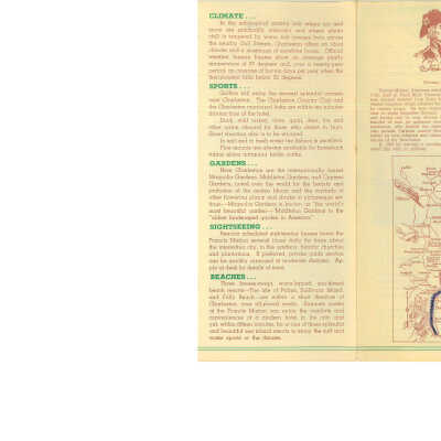 Scan of a brochure for the Francis Marion Hotel, "Largest and Finest Hotel Conveniently Located in the Heart of the City." (H. Oliver Riley, Manager.) Features a description of the hotel and information about the climate, sports, gardens, sightseeing, and beaches in Charleston. Includes a drawing and brief description of Francis Marion, "Swamp Fox," and a map of the travel route from New York to Charleston, marked by the donor's parent. Also includes aerial views of the hotel and vicinity, of Hampton Park, and the Charleston Municipal Yacht Basin, and a photograph of a hotel room.