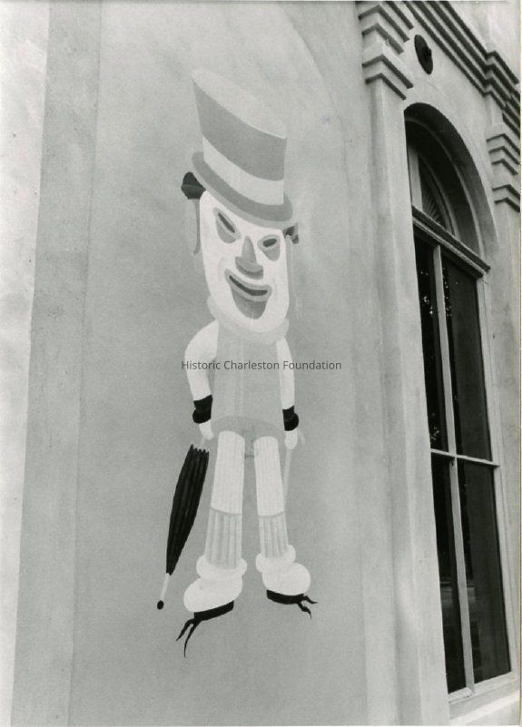 B&W photograph of the "Hat Man" painted on the Church Street side of 47 Broad Street. Window at right.Collection