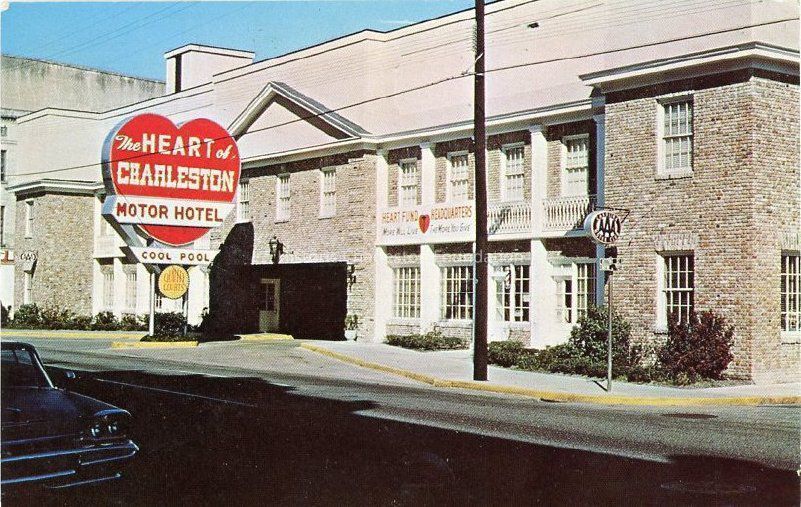 Color photographic postcard of The Heart of Charleston Motor Hotel, which was located at 200 Meeting Street, on the east side of Meeting between Hayne and Pinckney Streets. The heart-shaped sign in front advertises "Cool - Pool," with another sign for "Quality Courts" below it. Banner for "Heart Fund Headquarters" spans the second floor balcony.