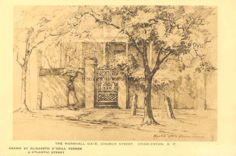 Postcard (scan) featuring a drawing of the Marshall Gate (39 Church Street) by Elizabeth O'Neill Verner. Early 20th century view.Collection