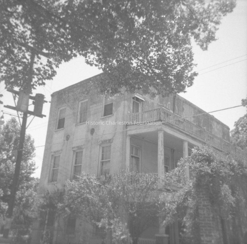 B&W photograph of house that was originally numbered 11 George Street, corner view, north (front) and west (piazzas) elevations. It had been located two lots to the west of the current 11 George (where a 15 George would be located if it existed). This house and the house directly its east -- the original 9 George -- were demolished for the construction of a parking lot.Collection