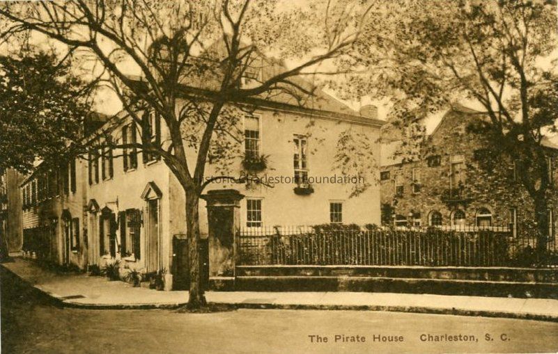 B&W photographic postcard of 143-145 Church Street (Alexander Peronneau Tenements a/k/a Pirate Houses), captioned "The Pirate House, Charleston, S.C." Shows the northeast corner of the building.Collection
