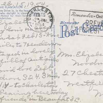 Back of postcard is postmarked February 15, 1954, and has a two-cent postage stamp. Captioned: "Modern up to date drive in, in the heart of the City. Catering to those who delight in clean, prompt and courteous service. Noted for their famous Plantation milk shakes and sandwiches."
