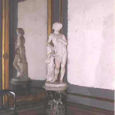 Shepherd Boy, by E.S. Bartholomew, American ex-patriate working in Rome, 1853. White marble sculpture of a Young Man Wearing a Sheepskin-Like Drapery Over His Midsection, Playing a Horn Or Flute. Figure Is Resting Weigh Over Left Leg, with Right Leg Relaxed and Slightly Behind Him. Both Hands Hold Horn. Youth Lans Against a Tree Stump with a Gourd Water Pouch Hung Over Its Branches. Ivy Grows Up the Tree Stump. Sculpture Rests on a Circular Base and Sits on a Marble Pedestal. Sculptors Name - Bartholomew- Is Carved on the Reverse of Pedestal.