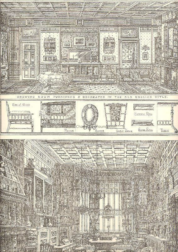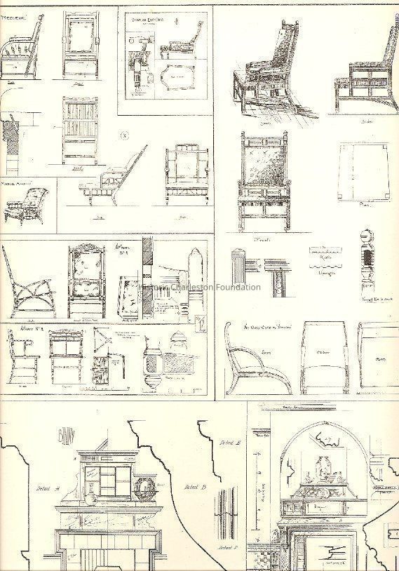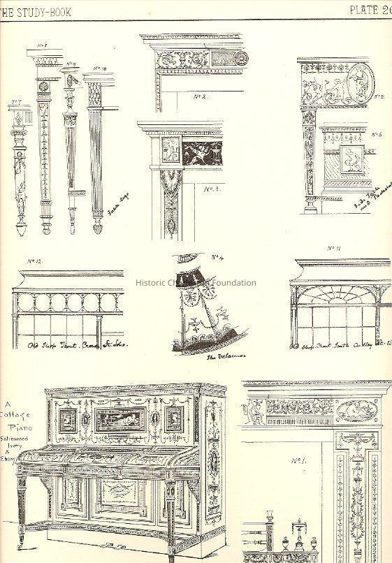 Complete title is The Study Book of Furniture and Furnishing, Being a Series of Fifty Six Plates of Designs Showing Interiors, Cabinet-Work, Upholstery, and Sundries. Contains 56 plates of detailed drawings of rooms, furniture, and interior ornamentation by a number of different architects and designers including Owen W. Davis, E. W. Poley, B.J. Talbert, W. Young, James Lamb, H.W. Batley, J.J. Stevenson, Thomas Harris, R.W. Edis, Henry S. Legg, E.W. Godwin, T.E. Collcutt, H. Henry, Maurice B. Adams, T. Cutter, and Walter Hensman.