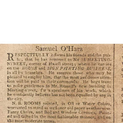 Contents include: advertisement for the runaway slave named Doll posted by James Missroon; advertisements for "pavillion gauze"; advertisement for Samuel O'Hara, house and sign painter, referencing his work at Nathaniel Russell's house.Created By