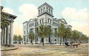 Postcard (scan) featuring the view of the U.S. Post Office and Courthouse and the corner of Meeting and Broad Streets (83 Broad Street). The St. Michael's Church columns are at left. Horse-drawn carriage on street.Collection