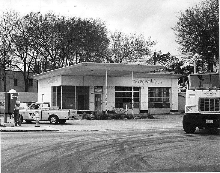 B&W photograph of The Vegetable Bin that was was located at the northwest corner of East Bay and Society Streets, formerly a Gulf Station.Collection
