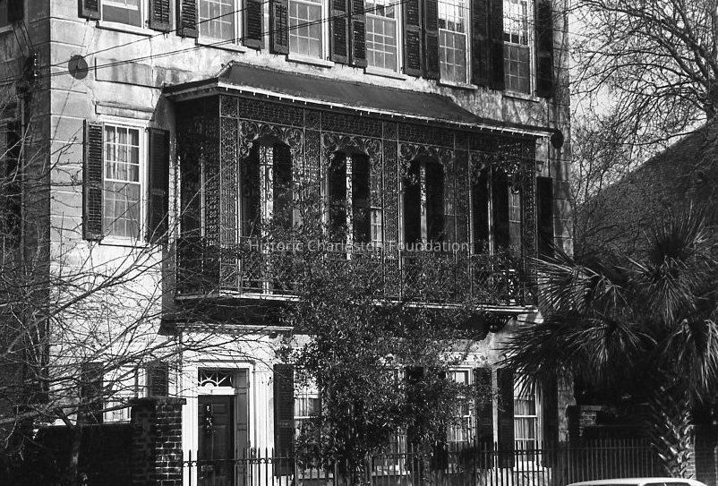 B&W photograph of the Thomas Tucker House (8 Meeting Street), west (front) elevation showing the cast-iron balcony on the second story. View partially obscured by trees.