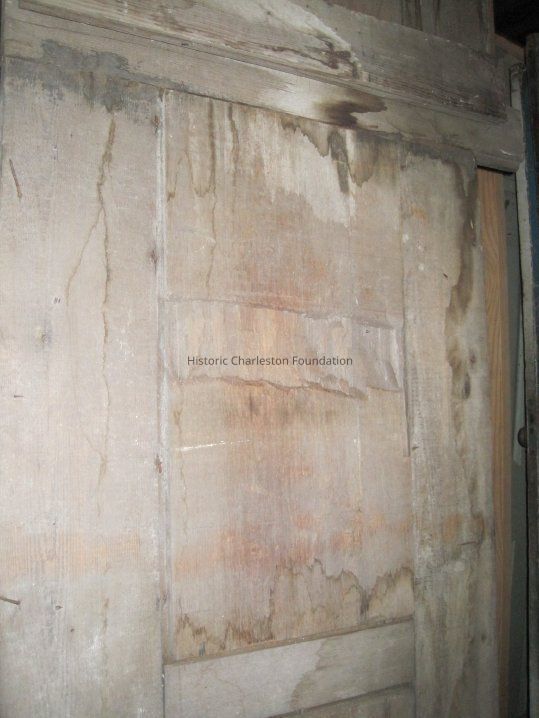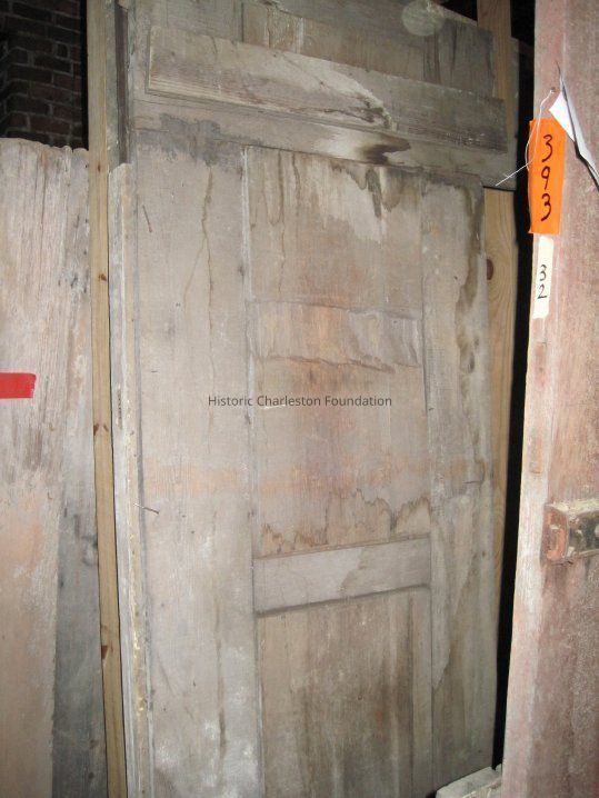 Three-panel door. Small panel across the top, two larger ones. Good condition.