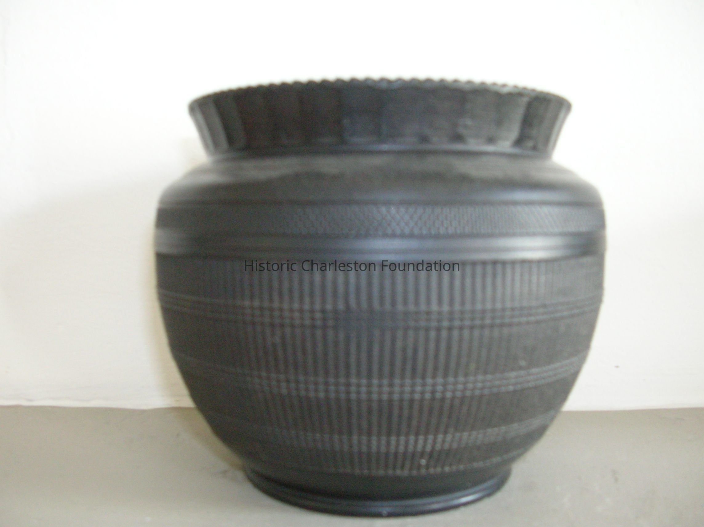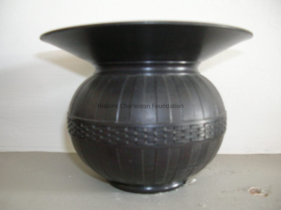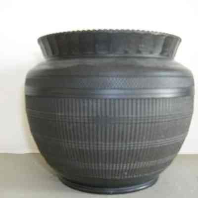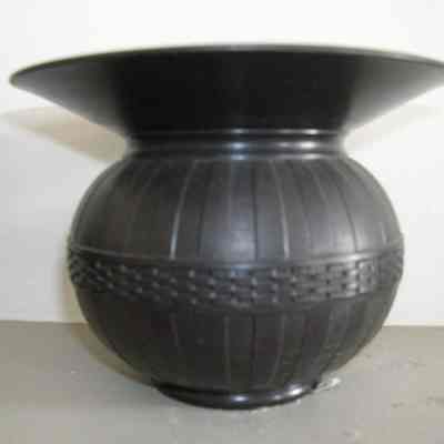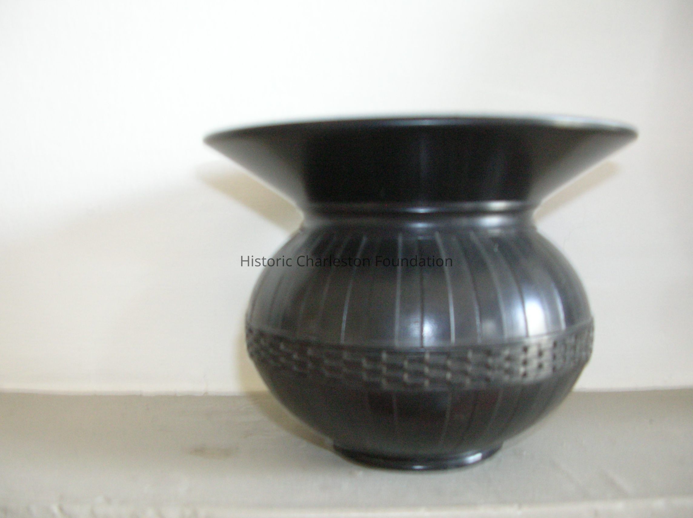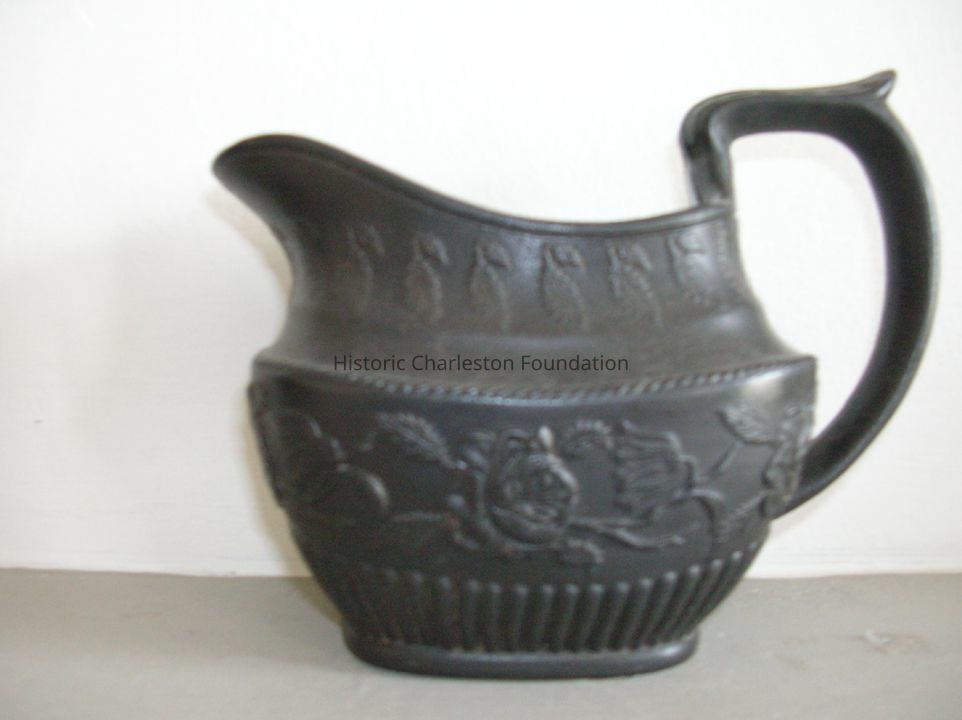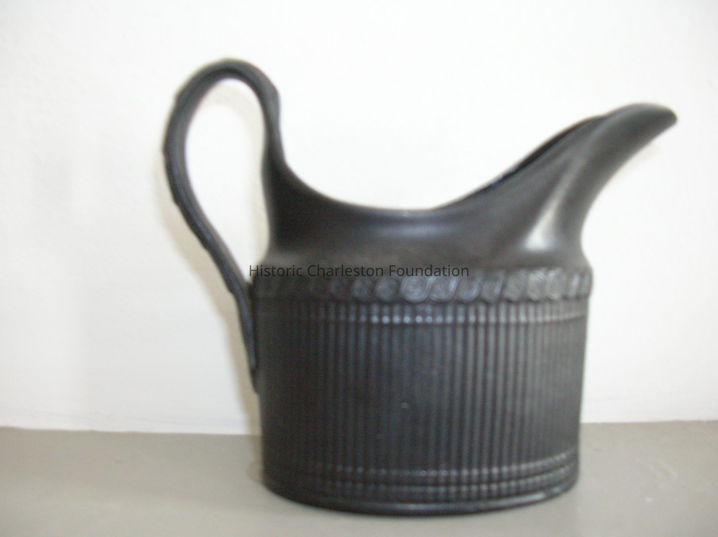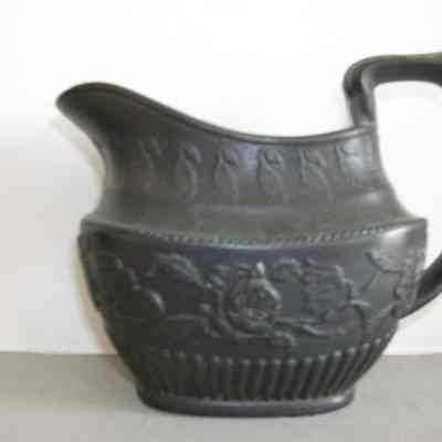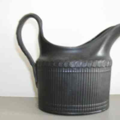 Black Basalt Ware Cream Pitcher, the Body with Engine Turned Reeded Decoration and Guilloche Border At Top. Foliated Leaves on Handle. Glazed Interior, Bisuit Exterior. Bowls with Wide Lips, Bodies with Engine Turned Decoration of Central Basket Weave Band with Vertical Stripes Top and Bottom, One Glazed, One BisquitCollection