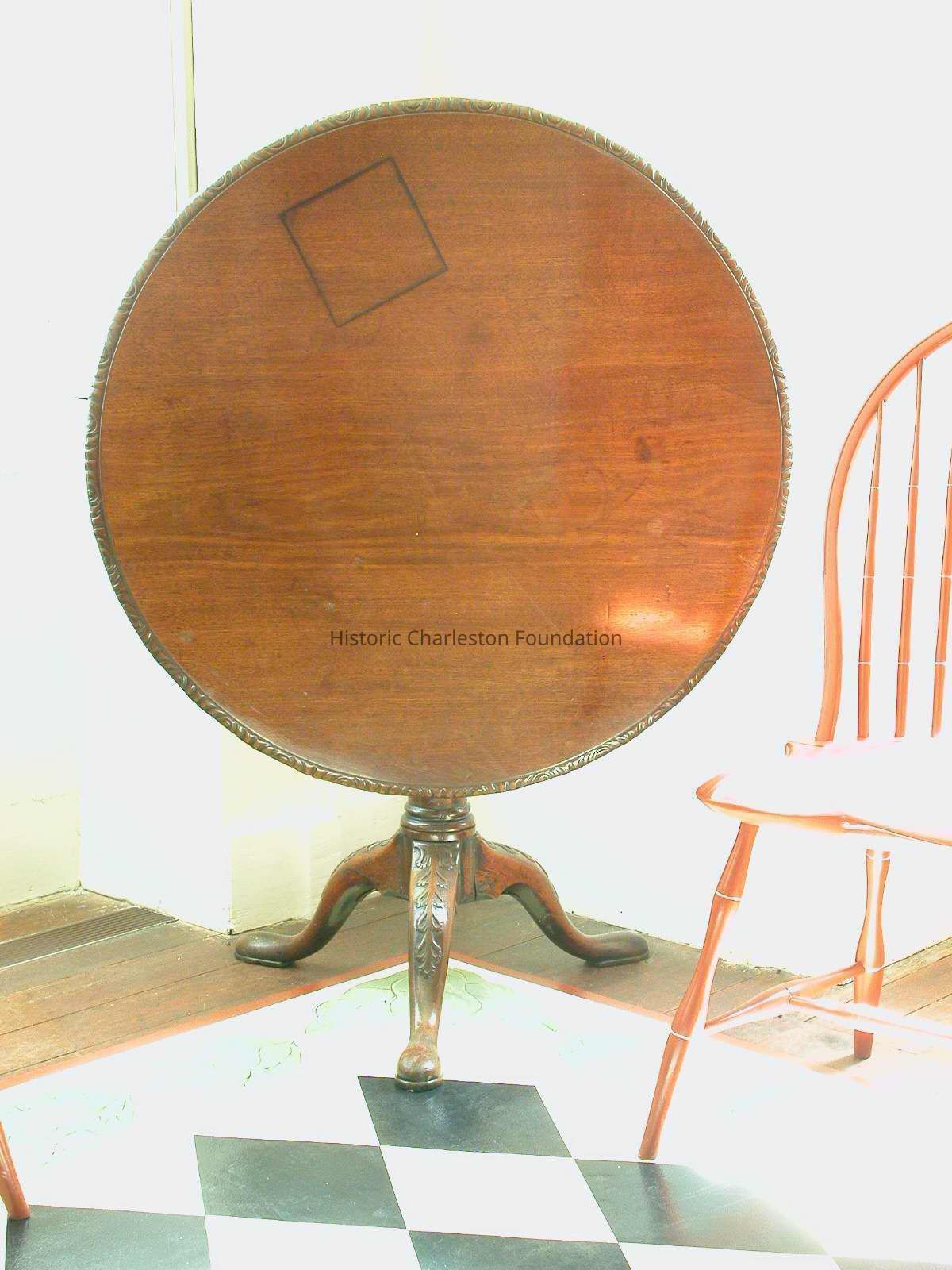 Round top with carved ogee edge is supported on a tenoned birdcage on a tapered and ringed cylindrical pillar, descending to tripod cabriole legs with foliate carving on the knees and padded snake feet.Collection