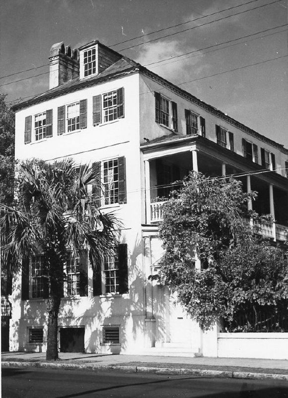 B&W photograph of the Timothy Ford House (54 Meeting Street), corner view of house showing the west (front) and south (piazzas) elevations.Collection