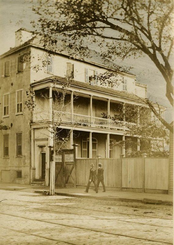 Photograph (scan) of the Timothy Ford House (54 Meeting Street), corner view of house showing the west (front) and south (piazzas) elevations. Wooden fence borders the lot. Two men walk on the sidewalk in front of the house.Collection