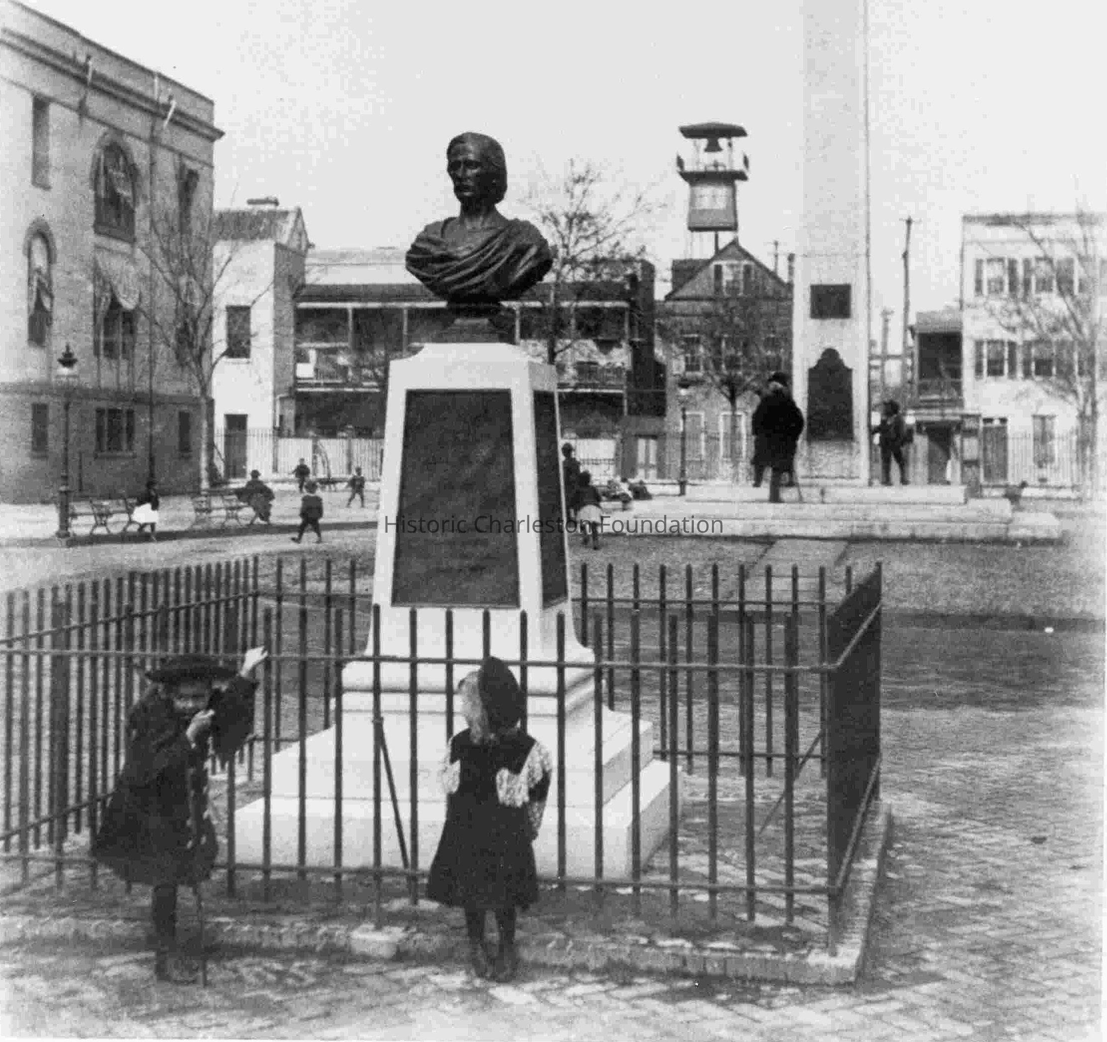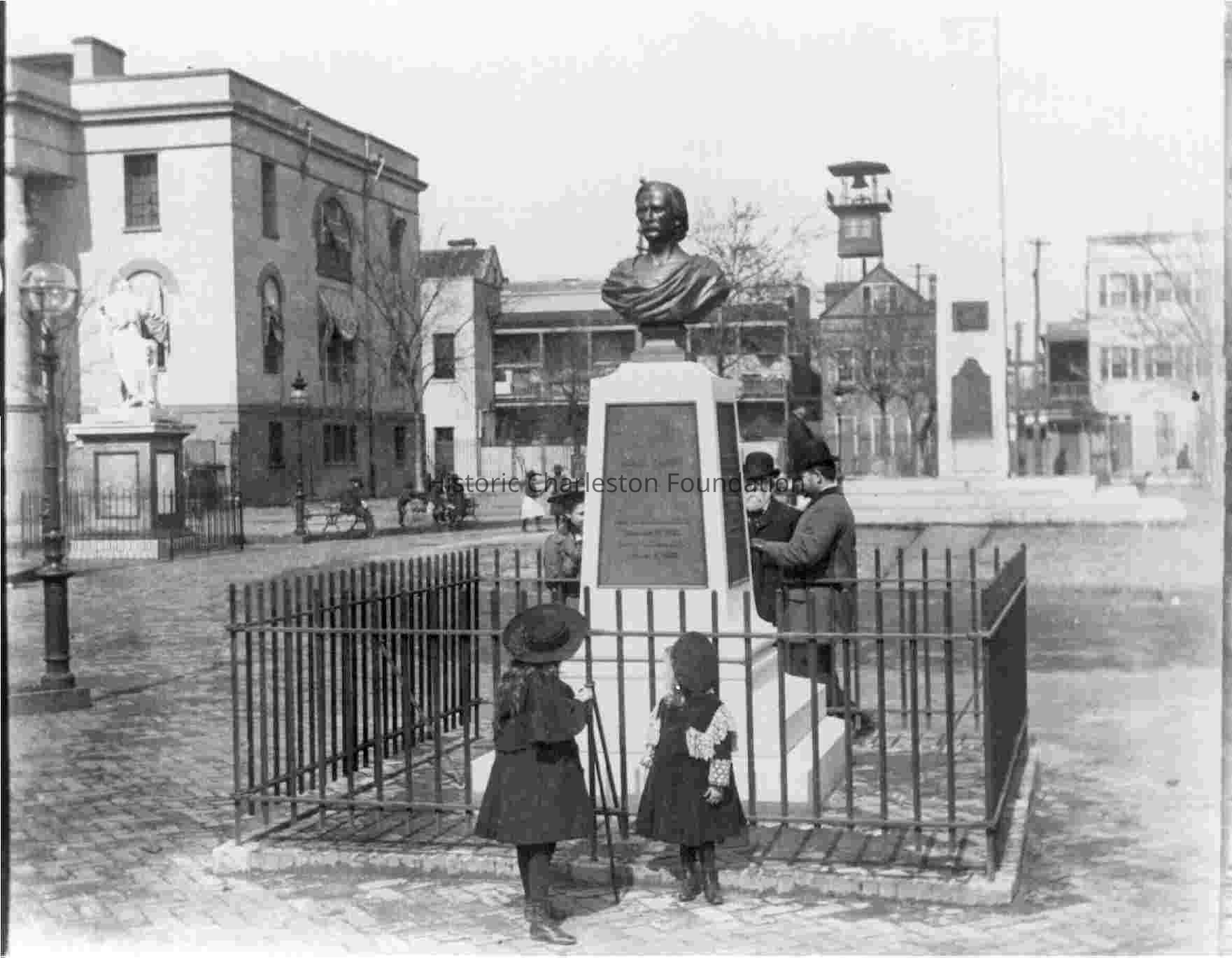 Two photographs of the statue (bust) of the poet Henry Timrod in Washington Square Park, erected in 1901. Two young girls stand outside the iron fence that surrounds it. Other onlookers are on the other side. The monument to the Washington Light Infantry is in the background. The southeast corner of Fireproof Building can be seen (left) and the fire tower/bell tower (located behind old lower fire station at 116 Meeting Street) is in the distant background. Also in background is a rear view of 108 Meeting and 110 Meeting.Collection