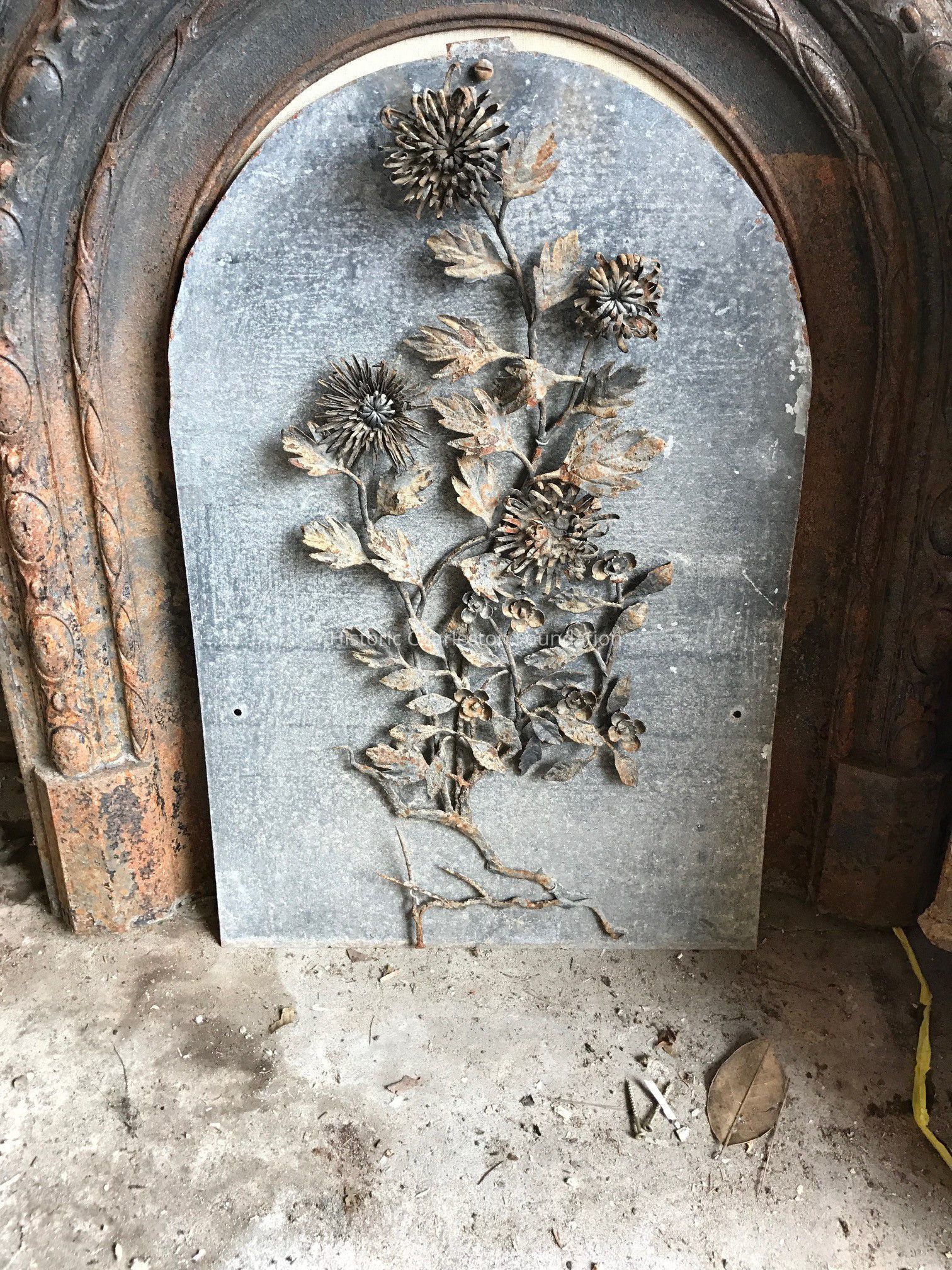 Tin fireplace insert with floral decoration removed from 44 South Battery.