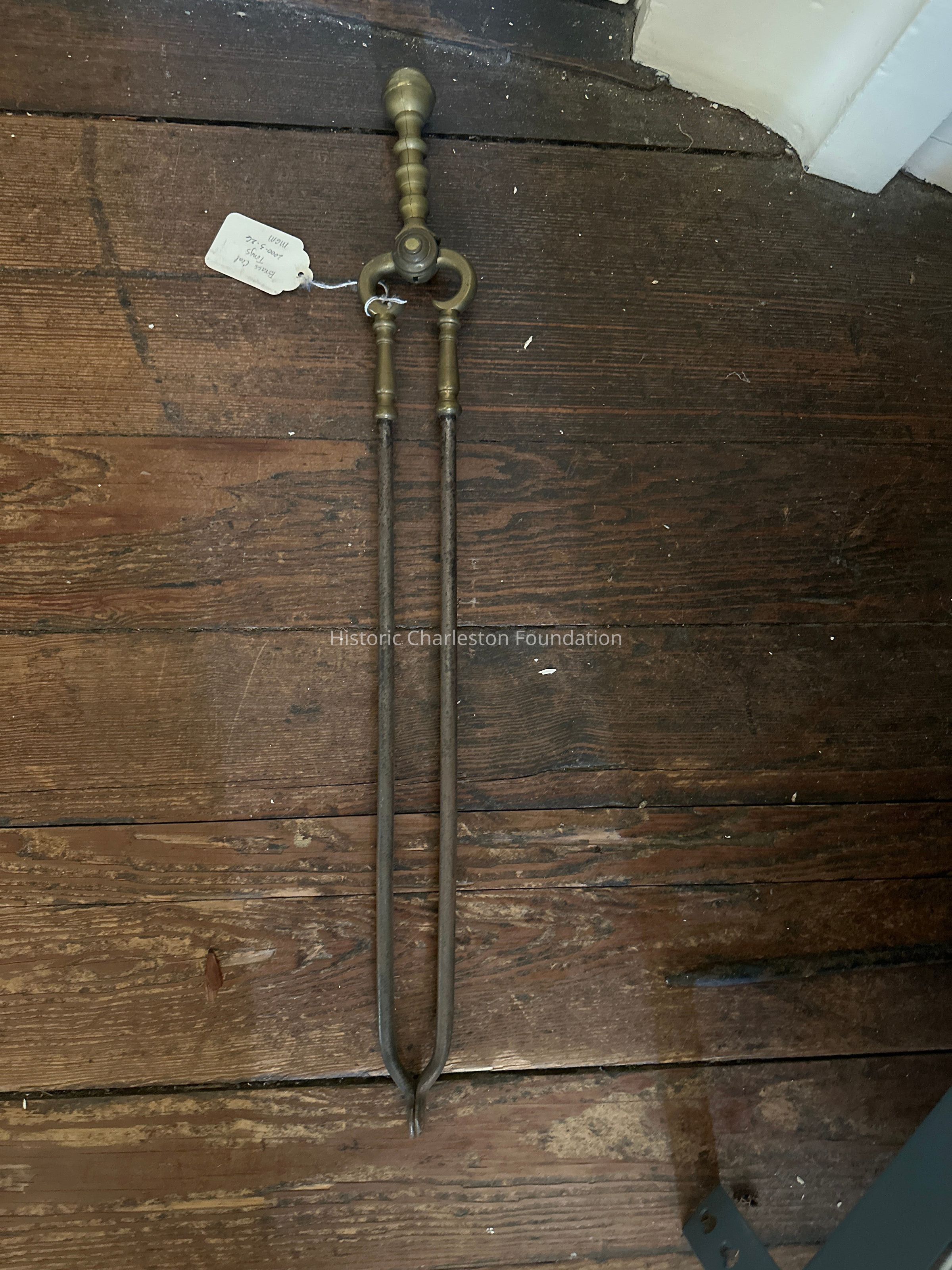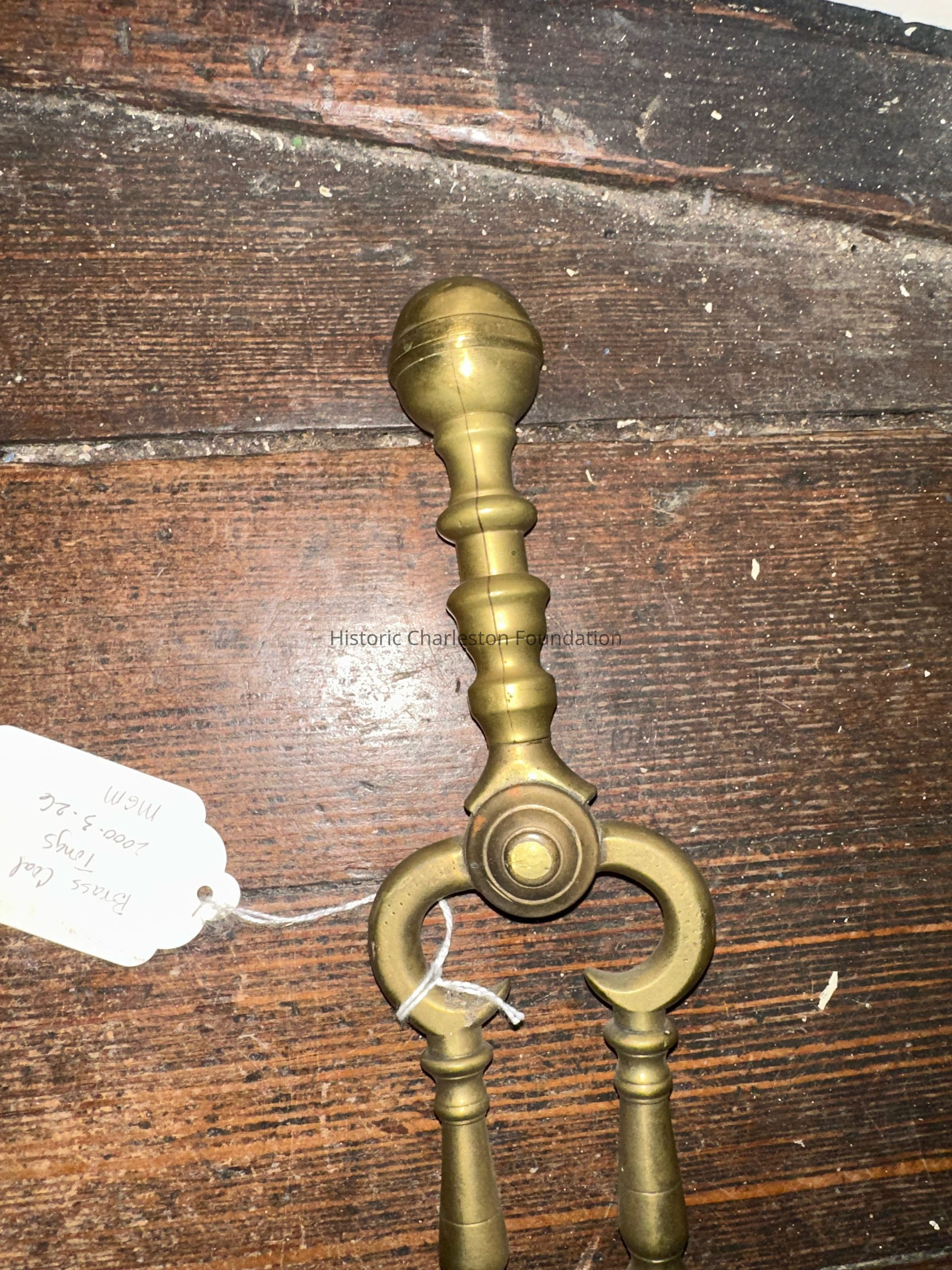 Brass coal tongs. Split ball to and banded neck that ends in circle and curves into two parts that extends to the tongs. Ends are round.Collection
