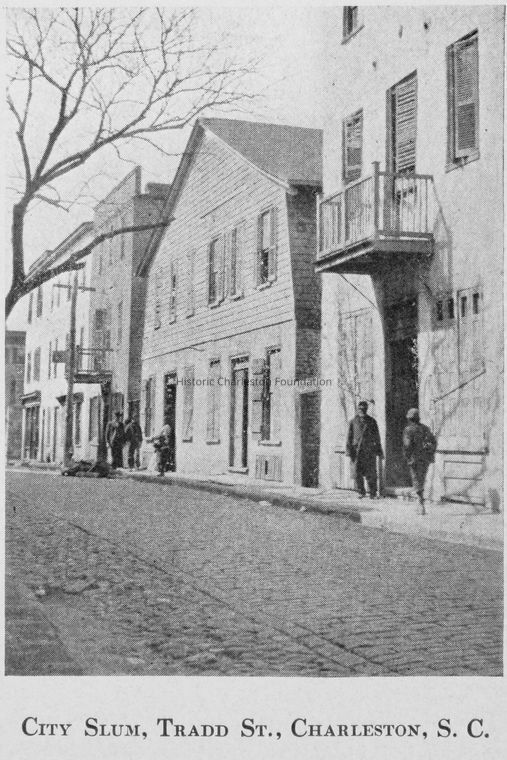 Captioned B&W photograph (scan) of Tradd Street streetscape at 4-12 Tradd Street. Entitled "City Slum, Tradd Street, Charleston, S.C." Original source "Christian Reconstruction in the South" by H. Paul Douglass, 1909.Collection