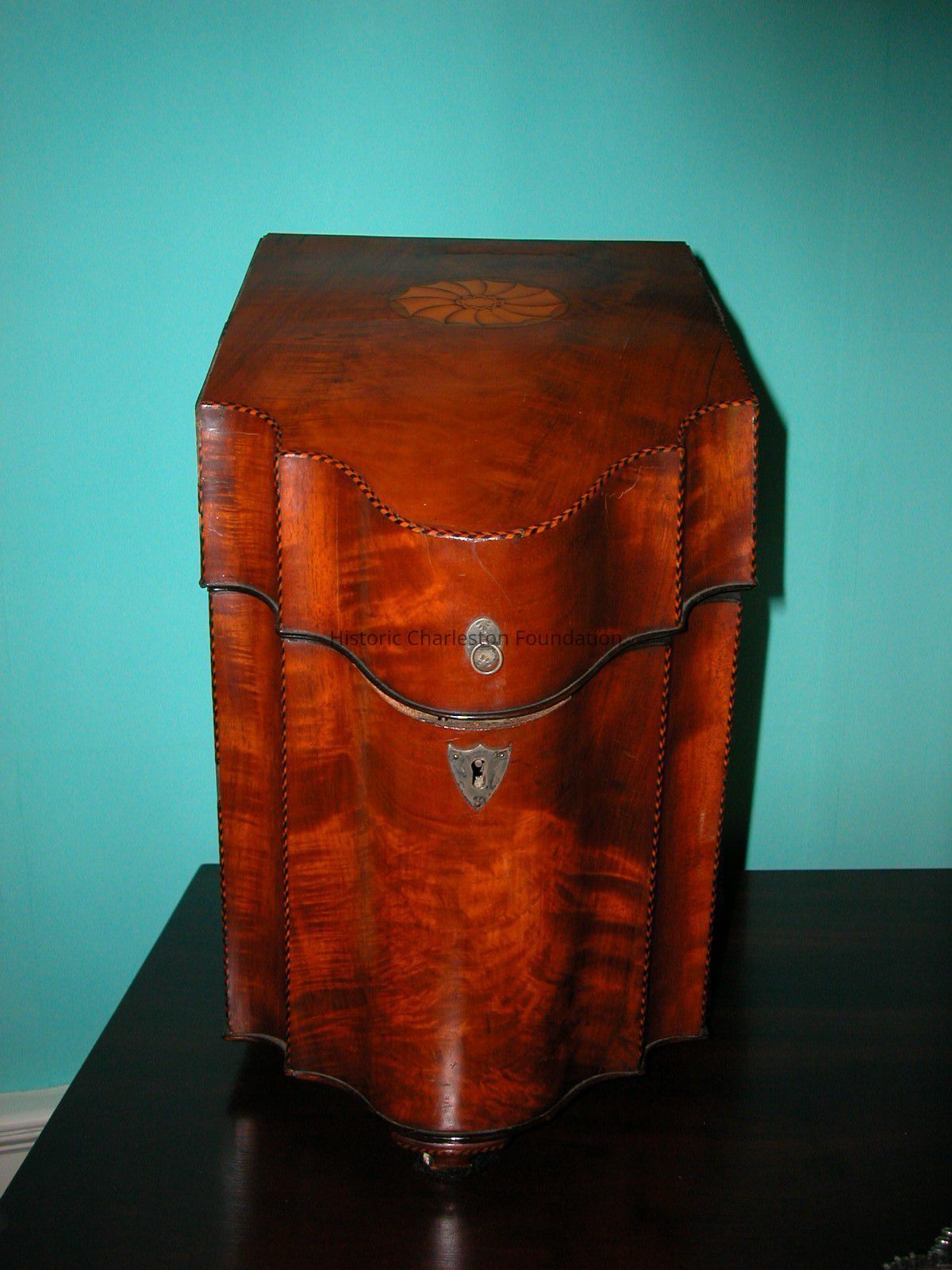 Pair of George III Mahogany knifeboxes, c. 1790. Each has sloped lid inlaid with an oval radiating medallion enclosing a slotted interior, the serpentine front with shielded form escutcheon, on bracket feet, the edges and interior with herringbone inlay, one slotted interior with the pencil inscription Mr. G. Moshall, the bottom of each with a label "Barkers Depository/Kensington" stamped "Mrs. M.R. Bishop/May 5 33/51."Collection