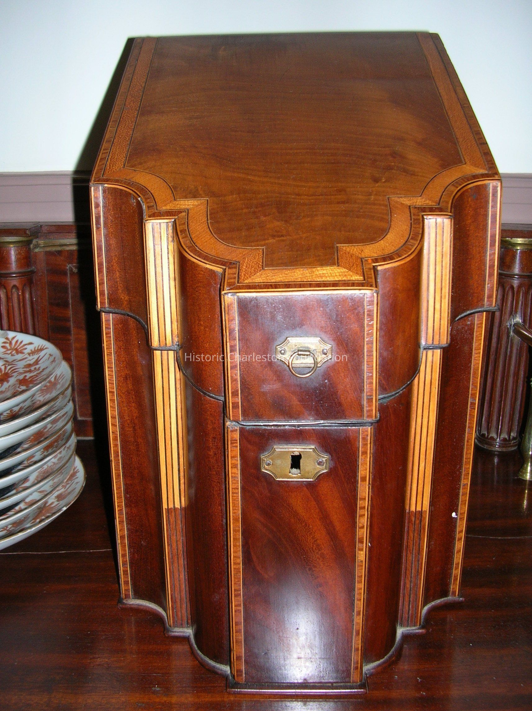 Knife Box, made of mahogany with curly maple, satinwood and ebony inlay. Lid is slanted. Brass pull and lock, appear to be original. Elaborate inlay on top of lid with stopped inlay down each side of front. Interior of lid is not varnished but has string inlay in shape of diamond, using satinwood. Brass hinges on back of lids are different shapes on each box. Interior cutlery sorter is removable, made of mahogany with satinwood inlay to visually divide the openings. Three full columns with twelve rows, and a total of forty-six openings. Large old gouge above key lock. Inlay has been replaced in areas.Collection