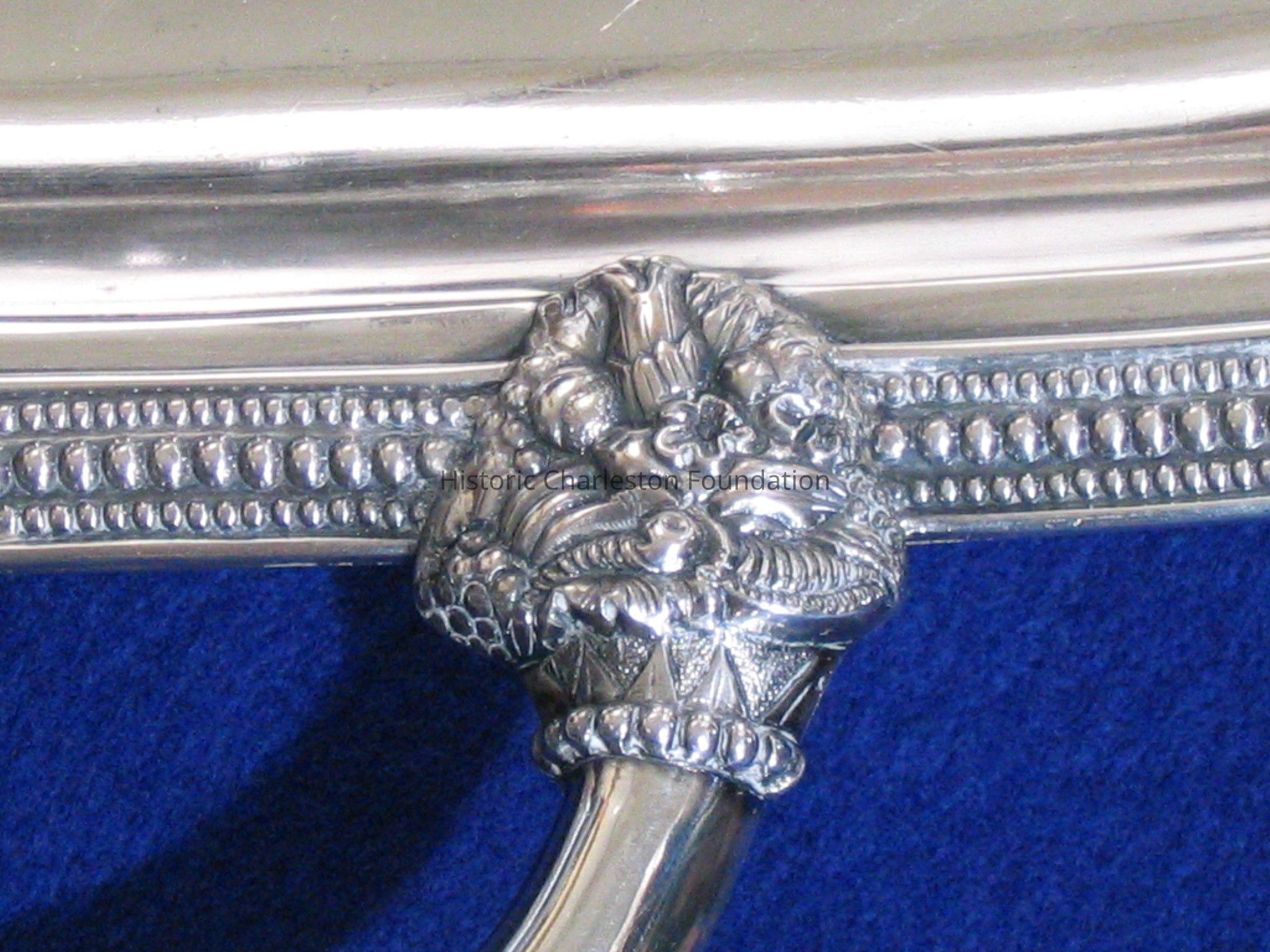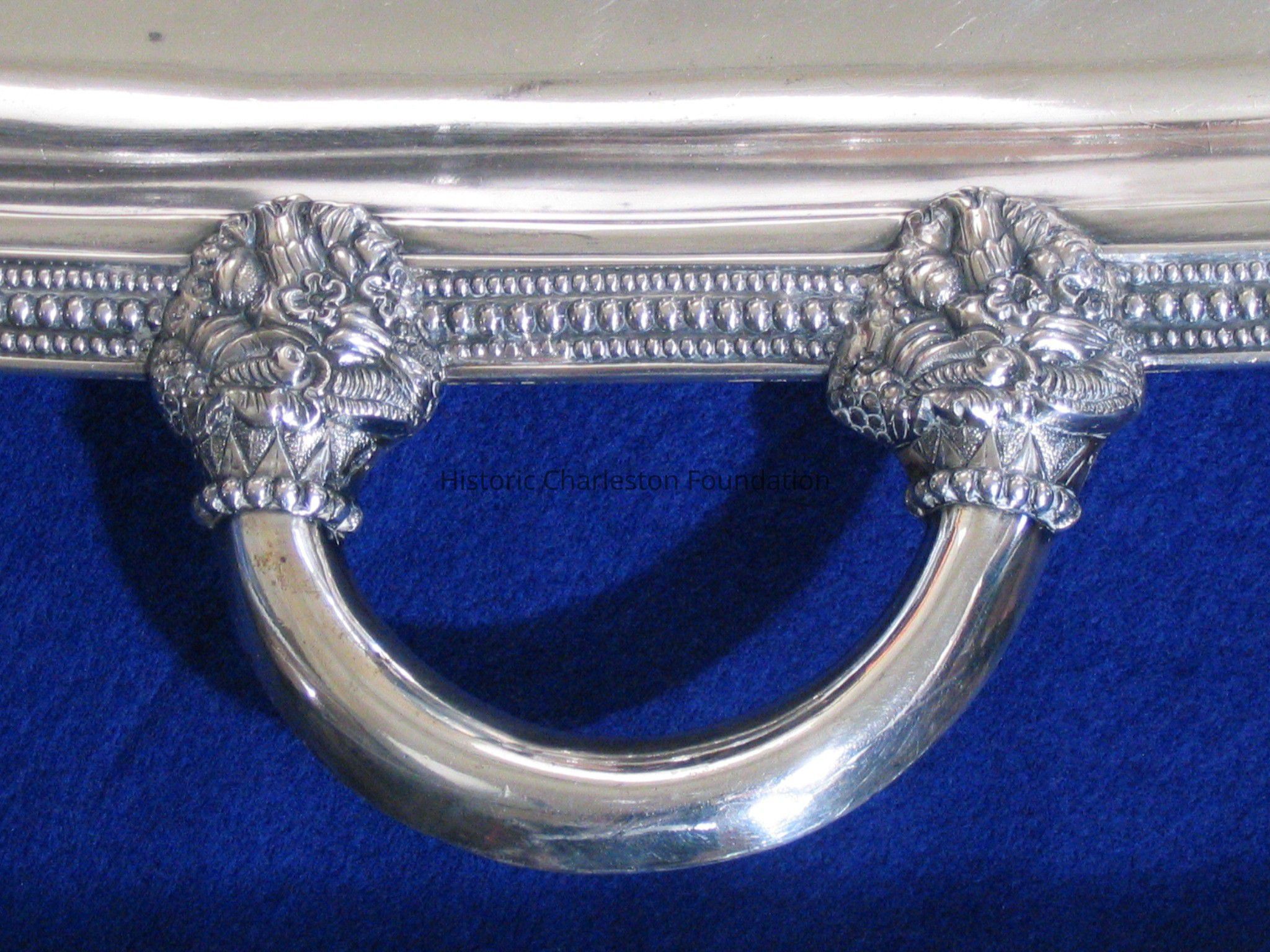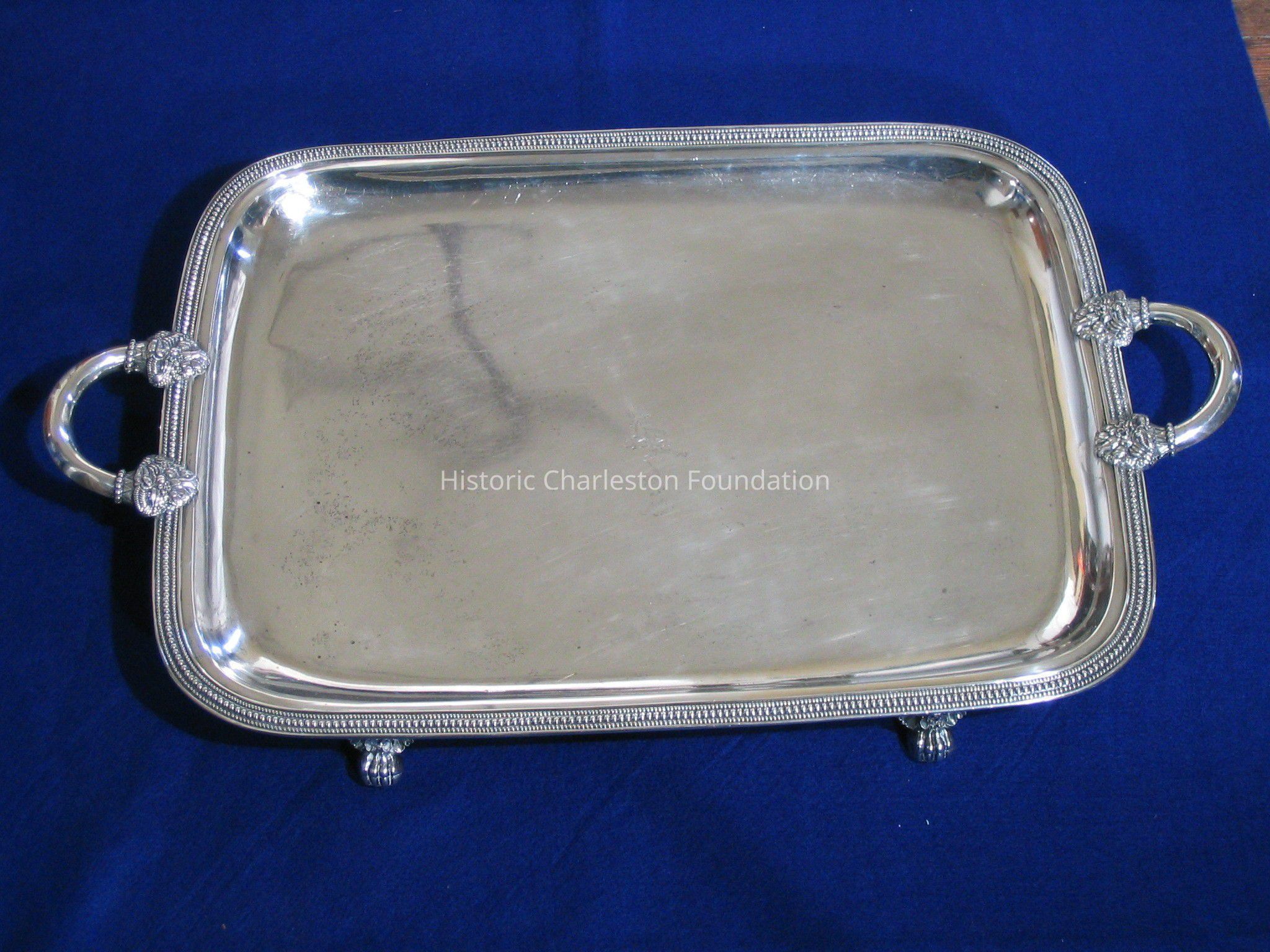 Large, rectangular, silver plated tray with two handles. Beaded Border surrounds edge, handles have two decorative baskets on each side consisting of fruit and flowers, tray is monogramed with W.H.A. on back, Crest on front is associated with the Aiken-Rhett house which is a recumbent stag facing left with an arrow piercing its neck laying on a rope with six twists. signature/maker is THIBAULT & BROTHERS stamped on back. Tray sits on four claw feet with botanical motif (gadrooning).Collection