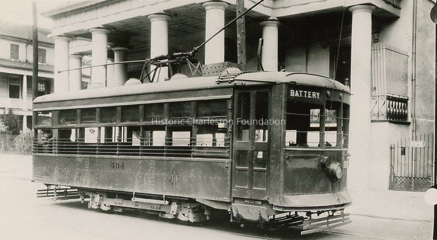 Trolley Car, car #404 (Battery route), stopped in front of South Carolina Society Hall on Meeting Street.Collection