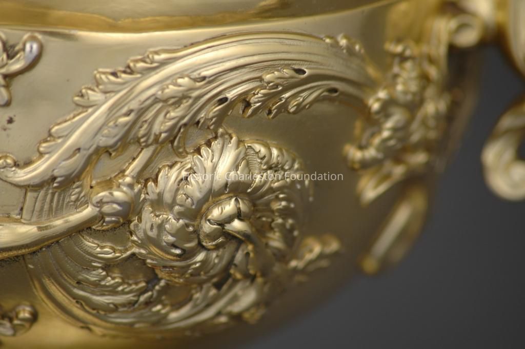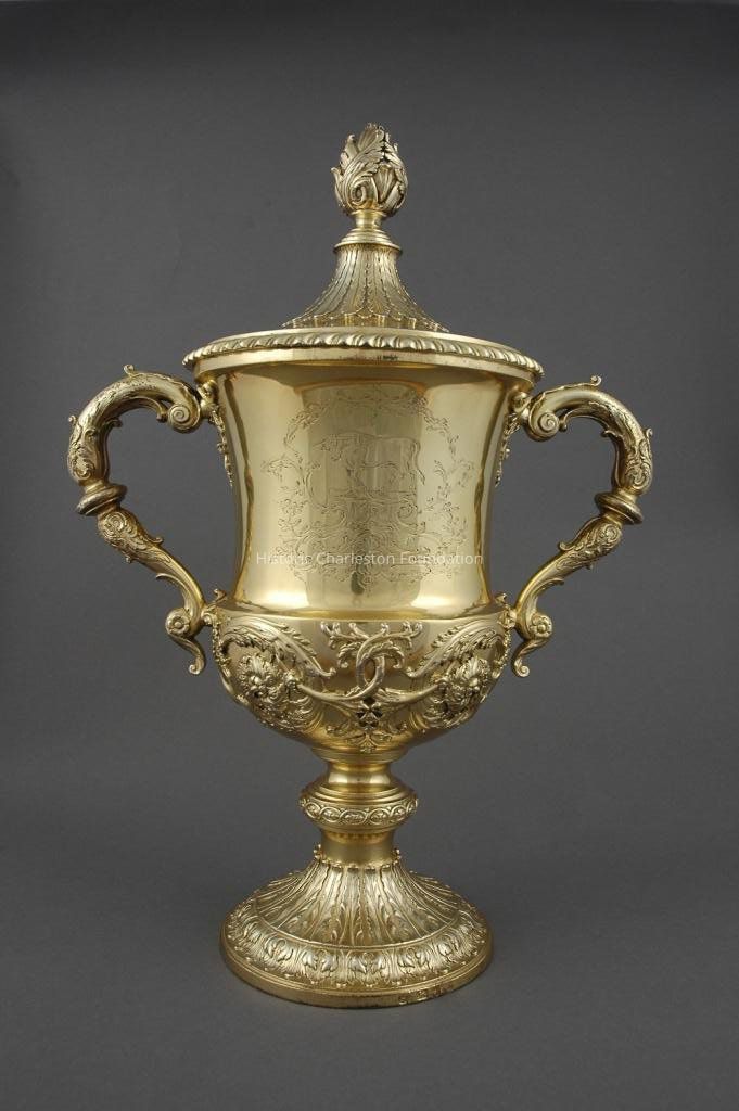 The design for this cup was commissioned in 1736 by Colonel James Pelham from the architect and designer William Kent. From it George Wickes made what is now known as the Pelham Gold Cup, the first of many cups done to this design, which was popularized in 1744 with John Vardy's publication of "Some designs of Mr. Inigo Jones and Mr. William Kent". Wickes's London firm had been appointed goldsmiths to the prince of Wales in 1735. As Elaine Barr remarks in her monograph of George Wickes, the design contains "not so much as a hint of rococo", and "its classical restraint strangely foreshadows Robert Adam." In light of this, and of the overwhelming popularity of the rococo style in the middle of the century, it is odd that the design should have remained popular all through the period (examples are known from the 1740's, 50's, and 60's). Sotheby's sale catalog described the design as a bridge between the late Baroque and neo-Classicism and indeed the decoration of the foot and cover is typical of Adam-style silver, and even the swirling foliage is seen on important pieces of early George III and neo-Classical silver such as the great wine cistern of the Earl of Huntingdon and the pair of soup tureens by Philip Rundell.