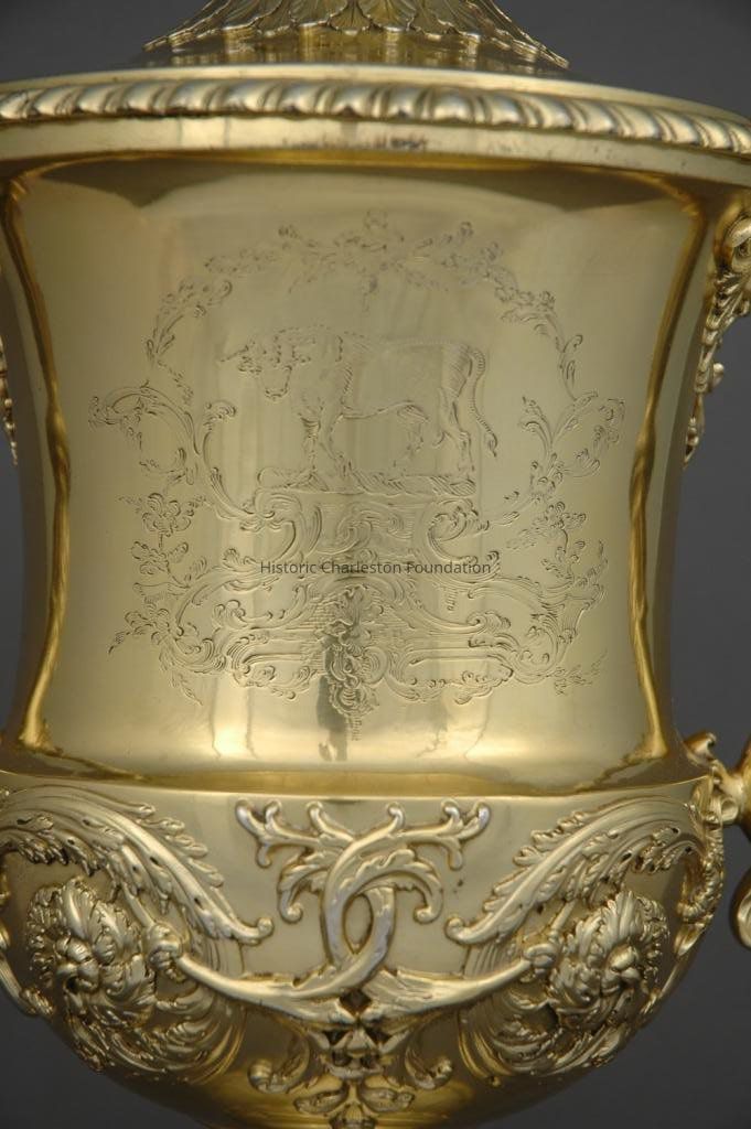 The Bristol cup retains its gilt-washed interior, but the body and cover were never intended for silver gilt, a later enhancement added to the Charleston cup. The engraved armorial design incorporates the Bull family motto: Ducit amor patriae (love of country leads).