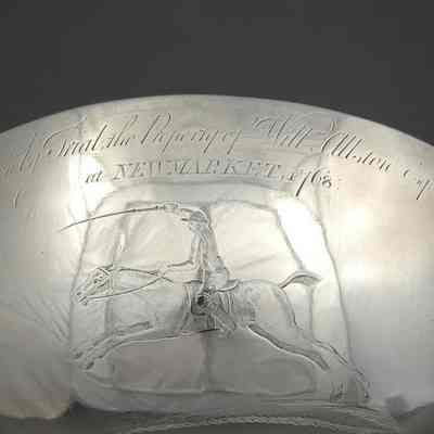 Drawing of a horse with rider (with crop outstretched) is below dedication of bowl.