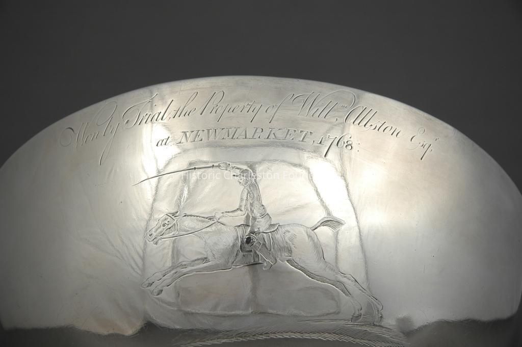In Charleston, it was the custom until the 1780s to present silver plate rather than cash prizes to the owners of winning horses. Tankards, cans and punchbowls-commemorative yet functional forms-were common prizes and used during celebrations after the race. Charleston silversmiths not only fashioned silver to be presented for the winners, but they also collected bets, as evidenced by Alexander Petrie and John Paul Grimke, and even sponsored races. Isaac Peronneau offered "a three pint silver TANKARD, and a silver PUNCH BOWL, value Two Hundred and Fifty Pounds, by any nine mares, horses, or geldings, to run a quarter of a mile and catch riders."