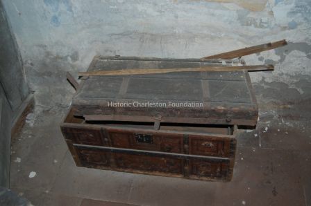 Square Trunk with Metal Hardware and Banding, Painted Design, Interior Tray, Paper Label Tacked on Reading "Mrs. A. B. Rhett, 48 Elizabeth Street, Charleston, South Carolina."Collection