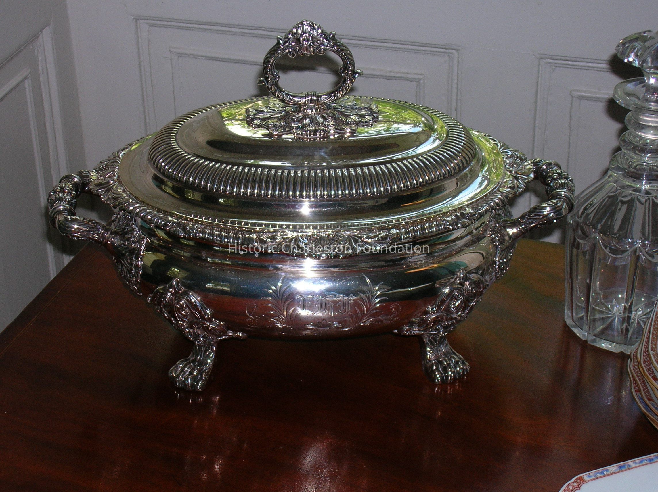 Four Footed Tureen and Cover By Craddock and Reid C. 1823. Handle At Each End, Gadrooned Edge with Embossed Leaves At Ends and Middle. Intials 'Ehf' Engraved on Front with Chased Leaves. Old Markings and Words 'Old Silver' Underneath.Collection