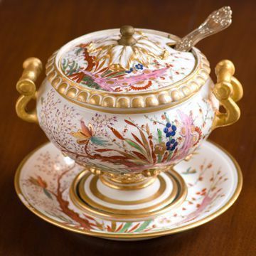 Sauce tureen, cover and stand, Worcester Flight, Barr and Barr, part of 'Japan' pattern service, circa 1813, cover molded with foliage enriched in gilding, with flower head finial on circular pedestal base Stamped on underside same.Collection