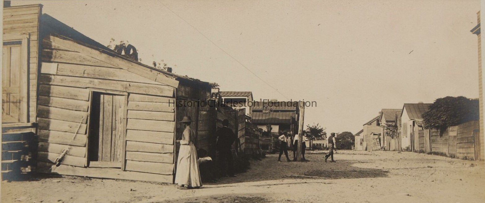 b-c: Two photographs of an unidentified downtown Charleston area showing a dense collection of one- and two-story wooden houses in an African-American community. Possibly located below Mt. Pleasant Street.Collection