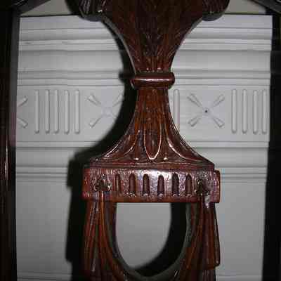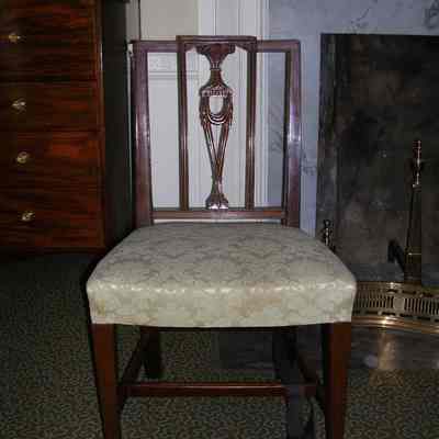 Square back Sheraton style Chairs. Central splat forms "Y," joined at top by carved swag and mounted Prince of Wales feathers. Plain tapered front legs. Side, rear, and cross stretchers. Arm chairs have molded arms attached at side rail. Upholstered in yellow silk.Collection