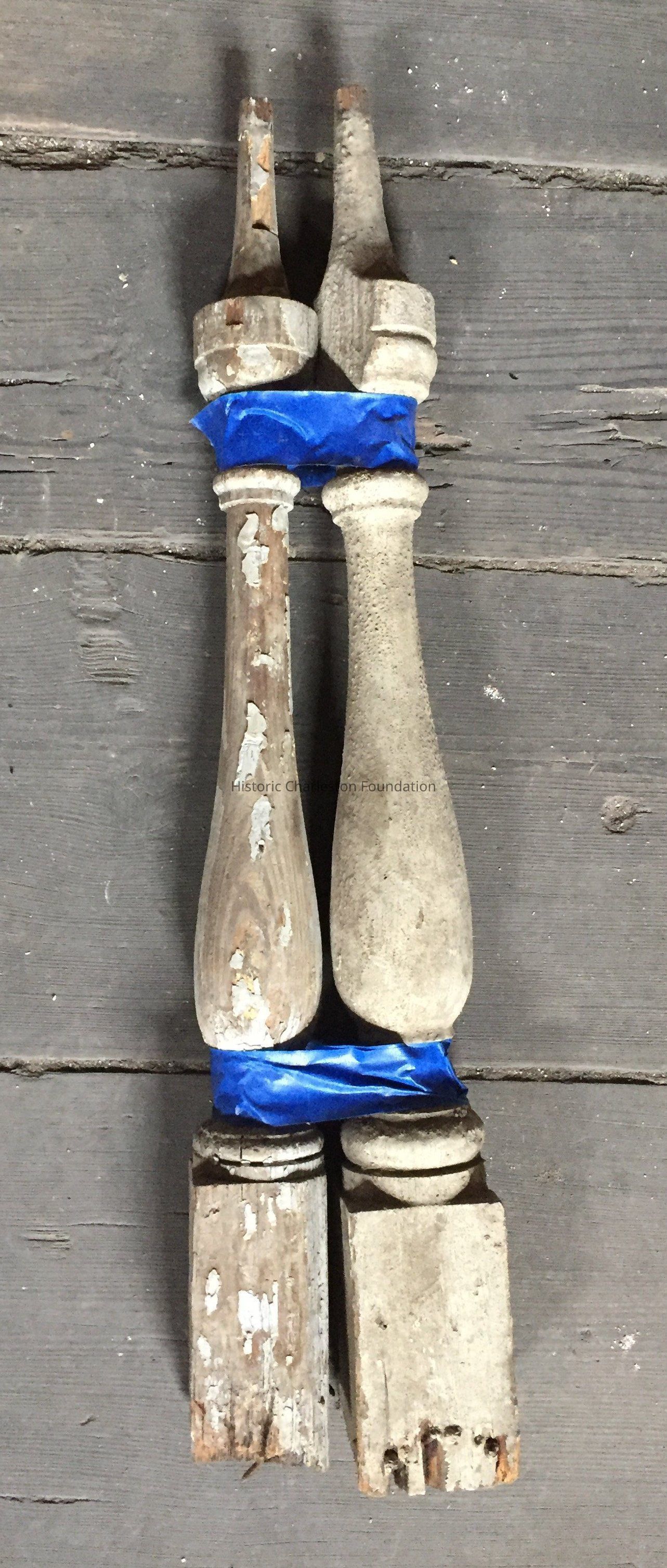 Pair of wood balusters. Some rotting, with large cracks and chipped paint.Collection