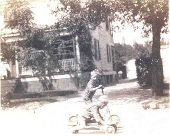 B&W photograph (scan) of two boys riding scooters in front of 26 Parkwood Avenue, ca. 1927.