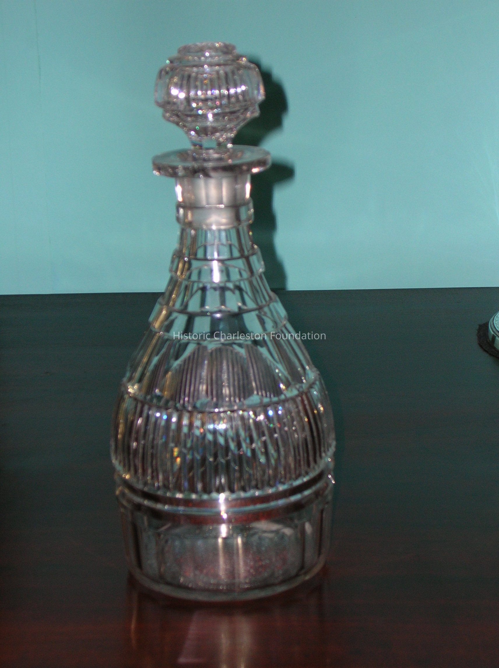 One with Facetted Bands and Vertical Central Panel. Round Stopper with Vertical Cut Edges. Other with Facetted Panels on Upper and Lower Body, Ring Turnings on Neck. Round Button Stopper with Cut Line Decoration