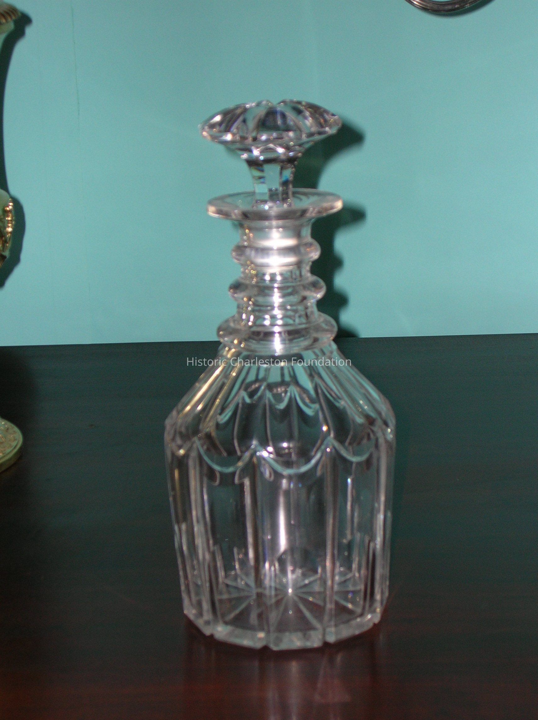 Cut Glass Decanters, Anglo-Irish, c.1810. One with Facetted Bands and Vertical Central Panel. Round Stopper with Vertical Cut Edges. Other with Facetted Panels on Upper and Lower Body, Ring Turnings on Neck. Round Button Stopper with Cut Line DecorationCollection