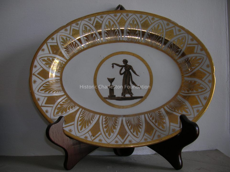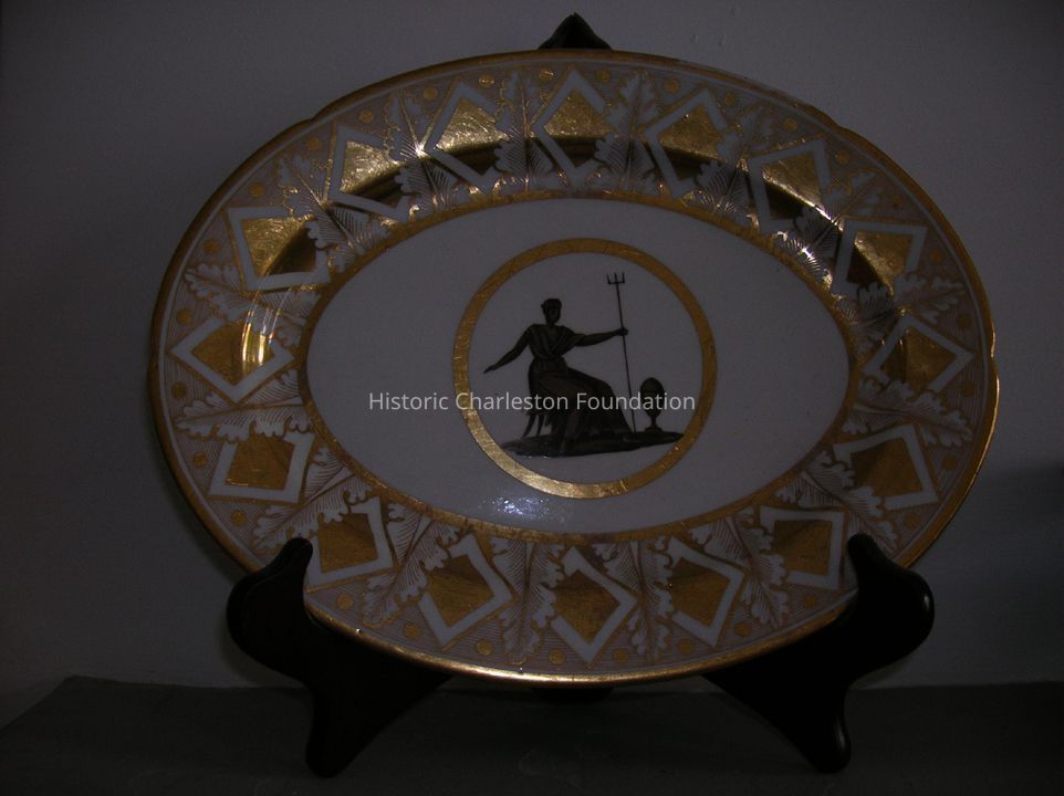 83.2.7-8 Pair of Oval Serving Dishes of White Porcelain with Differing Borders in Gilt of Stylized Diamonds and Acanthus Leaves. Each with Gilt Center Circle Enclosing Classical Figures in Grisaille and Gilt; One with Seated Robed Male Holding a Trident, One with Standing Robed Female Holding Fruit W. Right Hand Over Urn on Pedestal.