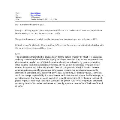 Streets, Postcards, St. Michael's Alley, Street corner, Church Street, Alleys--South Carolina--Charleston, Streets--South Carolina--Charleston, Historic buildings--South Carolina--CharlestonDimensions