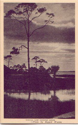 Lowcountry scene featuring trees in shadow, marsh grass at a marsh or swamp at dusk. B&W photographic print.Collection